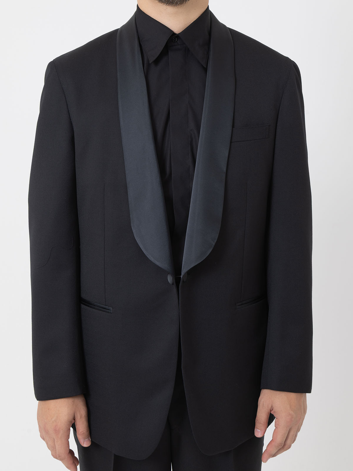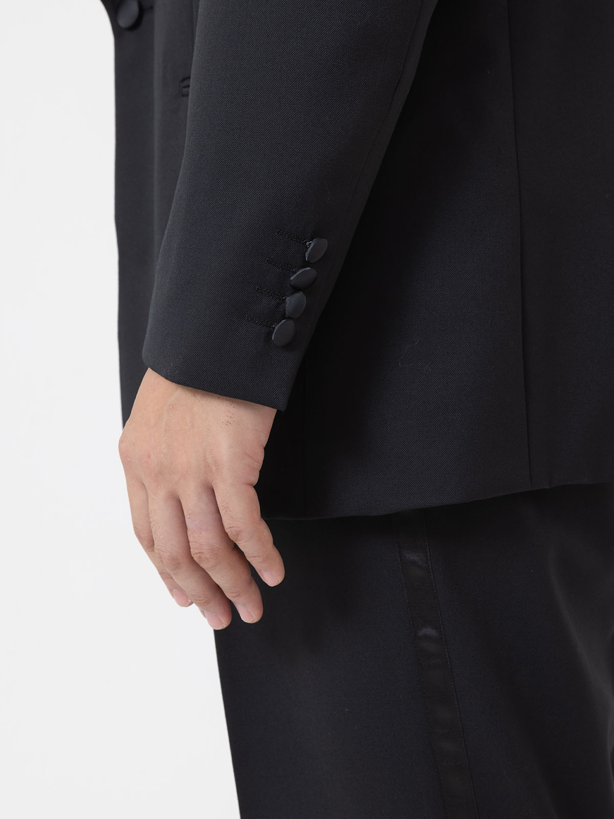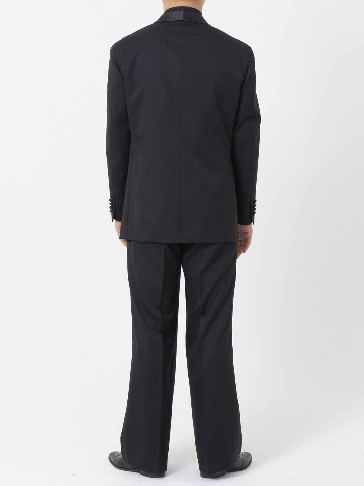 スタンダードなシングル1Bのタキシードスーツ。ラペルに拝絹、フロントに拝みボタン仕様はクラシックなタキシードのデザインです。軽やかな着心地を表現するために、肩パットは入れず、ナチュラルな肩周りにしています。