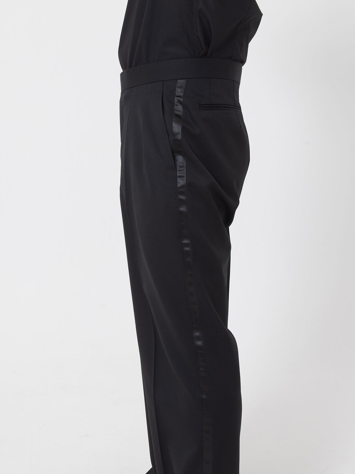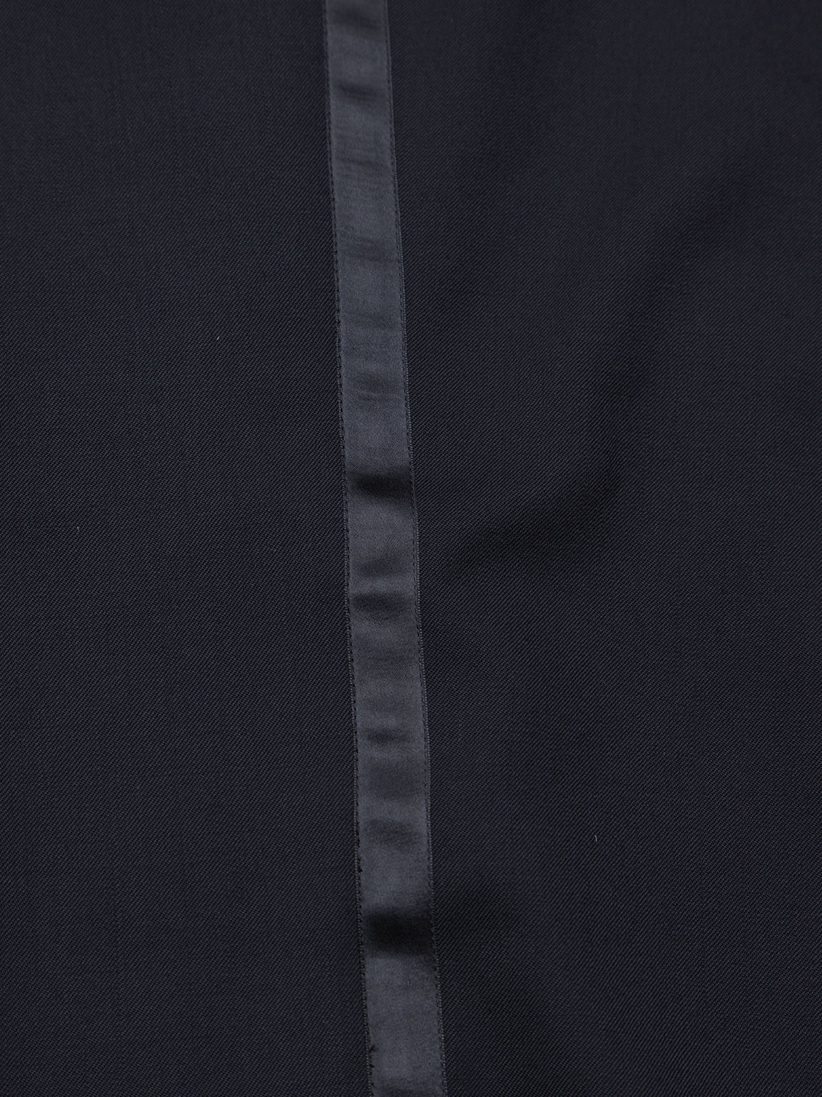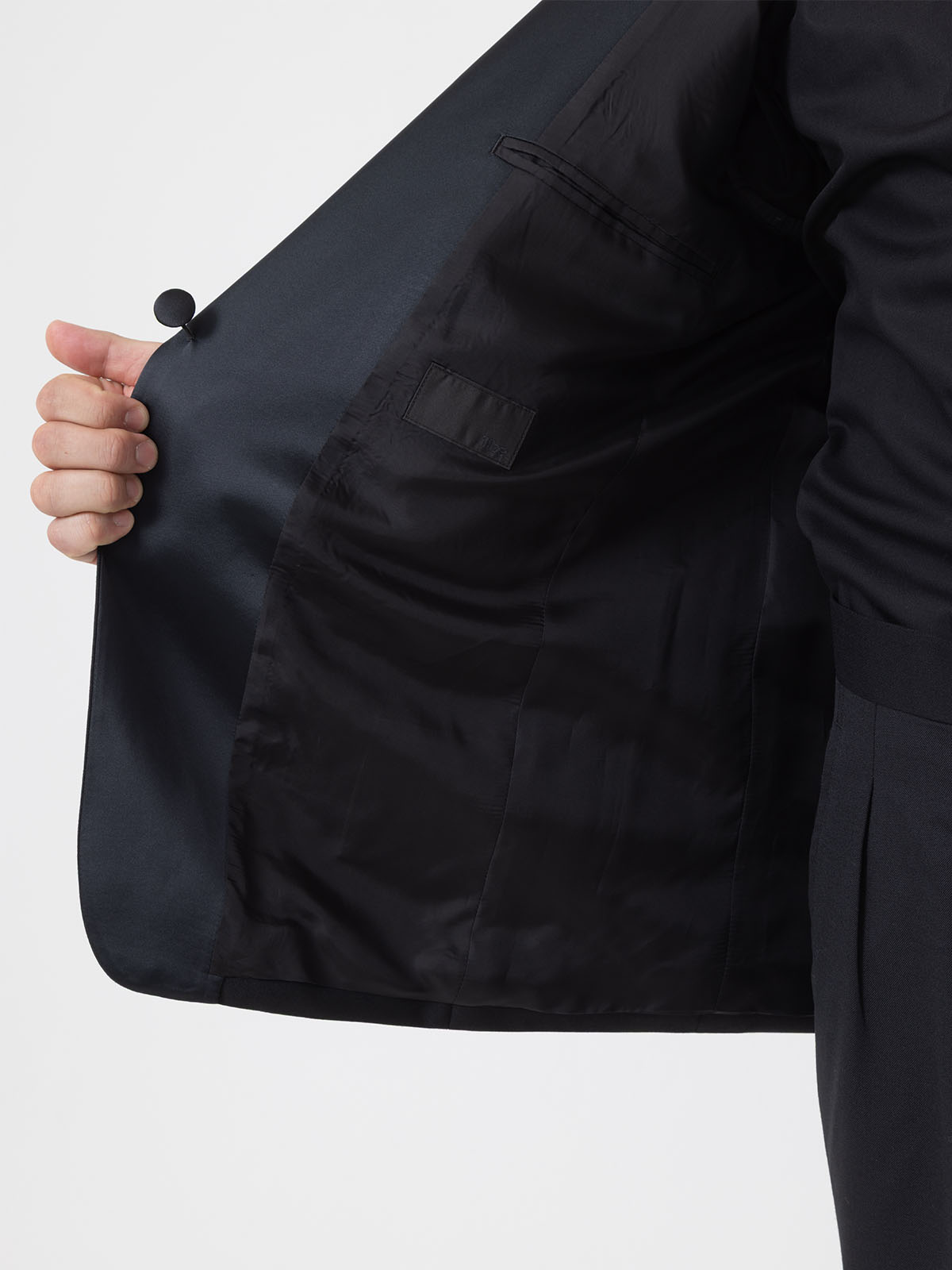 スタンダードなシングル1Bのタキシードスーツ。ラペルに拝絹、フロントに拝みボタン仕様はクラシックなタキシードのデザインです。軽やかな着心地を表現するために、肩パットは入れず、ナチュラルな肩周りにしています。