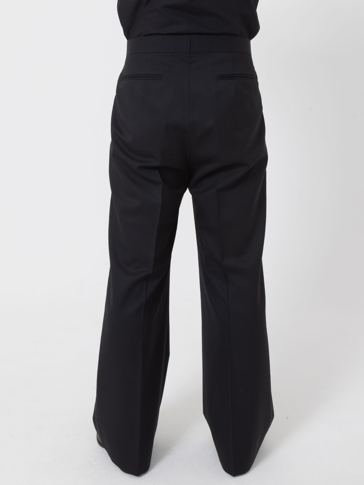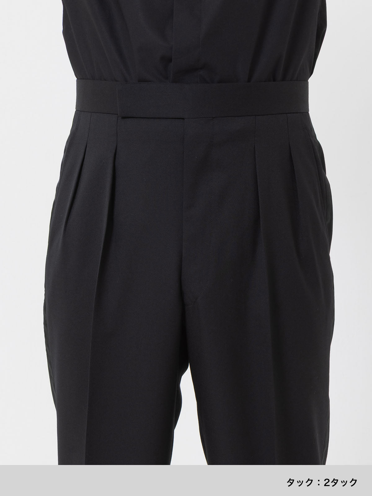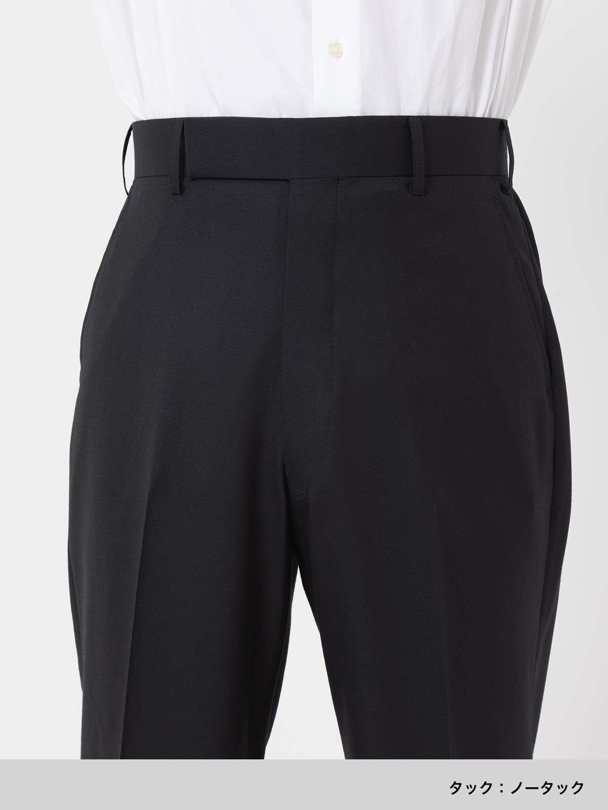 コンパクトなヒップ周り、深めの股上、渡り〜裾口までストレートに落ちるワイドストレートシルエットを採用しています。